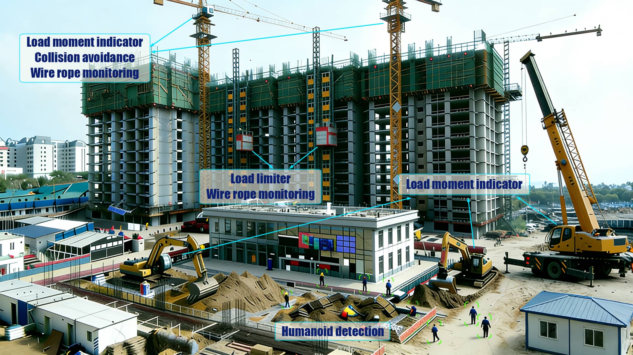 The system’s core integrates five monitoring modules. All data is transmitted in real-time to the monitoring center via industrial-grade wireless transmission technology, enabling collaborative management throughout the entire process. These include: a load moment indication system for excavators, mobile cranes, and tower cranes, which collects real-time equipment load and moment data to prevent overload risks; a tower crane and hoist wire rope monitoring system, which accurately detects wire rope wear, corrosion, and fatigue to eliminate the risk of wire rope breakage; a tower crane anti-collision system, which uses infrared sensing and positioning technology to avoid collision risks from multiple tower cranes operating simultaneously; and a site pedestrian monitoring system, which uses intelligent video analysis technology to achieve real-time identification of unauthorized personnel.