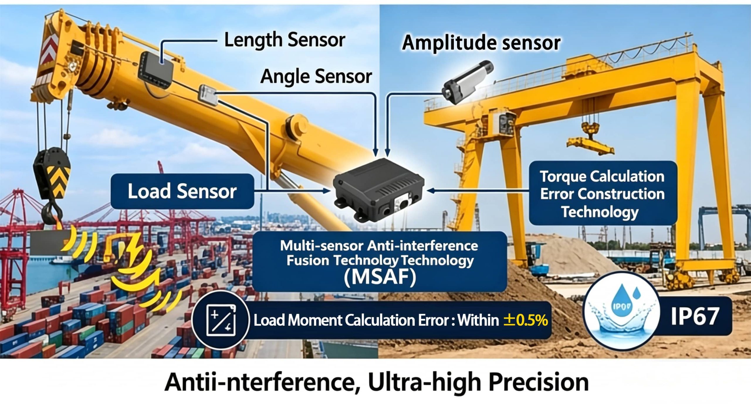 En segundo lugar, tecnología de fusión antiinterferencias multisensor. Integrando datos de múltiples fuentes sobre el peso de elevación, el ángulo y la longitud, el error de cálculo del par se mantiene estable dentro de ±0,5% incluso en entornos extremos, como fuertes campos electromagnéticos en puertos y altas vibraciones en obras de construcción, alcanzando un grado de protección IP67.
