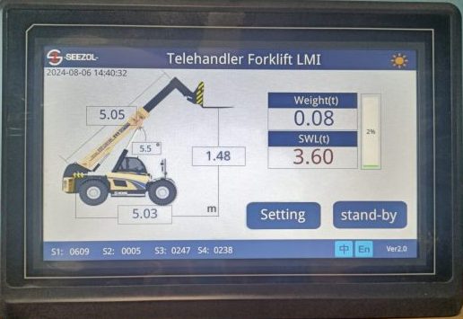 Carretilla elevadora telescópica Indicador de momento de carga también conocida como grúa LMI o Indicador de carga segura (SLI) Es un dispositivo de seguridad importante especialmente diseñado para carretillas elevadoras telescópicas.