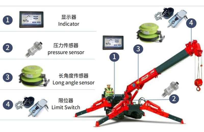 Indicador de carga do guindaste Spider, Também chamado Garça-aranha indicador de momento de carga(LMI), Garça-aranha indicador de carga segura(SLI). refletir a altura, amplitude, peso, sobrecarga e outras informações no monitor em tempo real através da interface de interação homem-computador e de vários sensores, para que a escavadora possa ser utilizada eficazmente pelo operador numa gama segura. Quando o Spider Crane excede o intervalo de segurança permitido, o sistema emitirá um alarme para lembrar o operador. Adequado para escavadoras, garras, carregadoras e outros equipamentos.